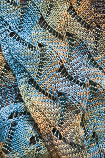The Undulating Waves Scarf was my first foray into designing with beads. It is based on a lace pattern that has lace stitches on both the knit and purl sides of the fabric. This allows the beads to float on the yarn-overs. Although I have marked this pattern as advanced, you will find that, with practice and perseverance, the pattern becomes quite easy! There is a KAL in the Schaefer Yarn Group on Ravelry that has excellent support and pictures.