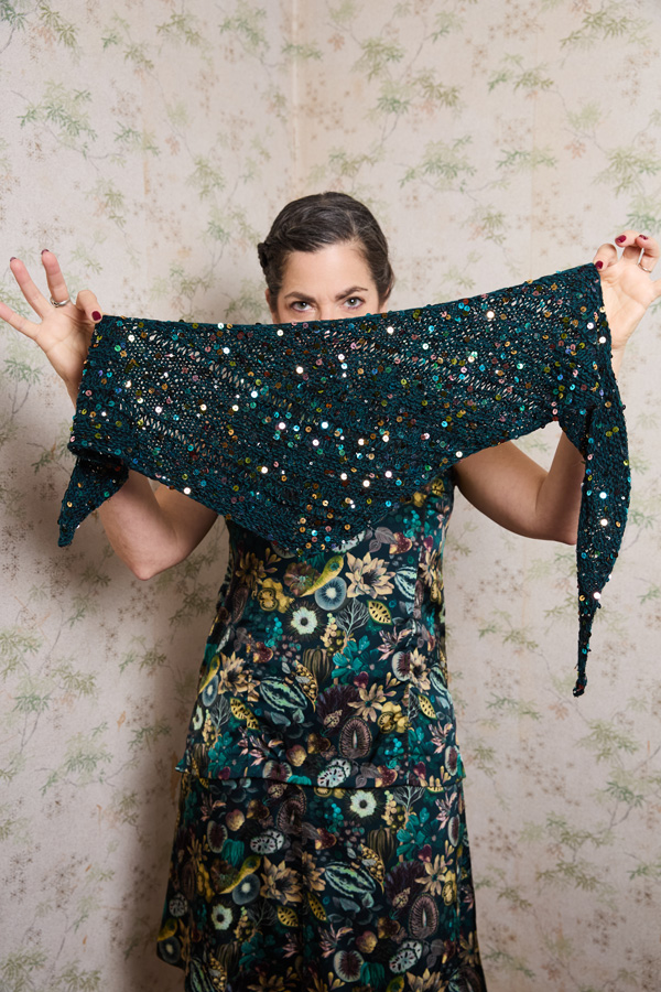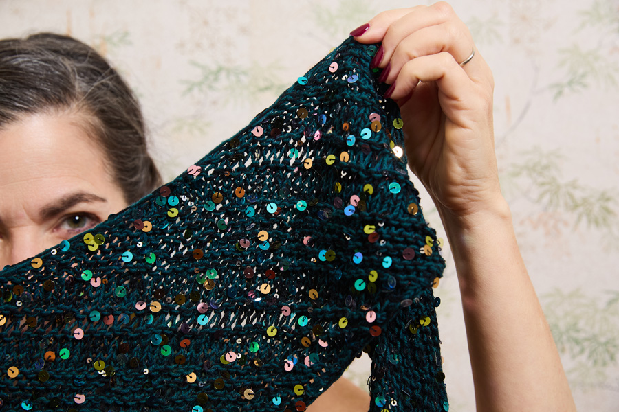 All three Blingola patterns are knit with two fabulous yarns — Lola’s Blingola (a 100% cotton with multi-colored sequins) and Pascuali Puno, a scrumptious cotton/alpaca blend. The fabric these two yarns make together is perfection. They are knit together at a loose gauge, allowing the fabric to drape and the sequins to easily pop to the front of your work. Knitting with bling has never been so easy!