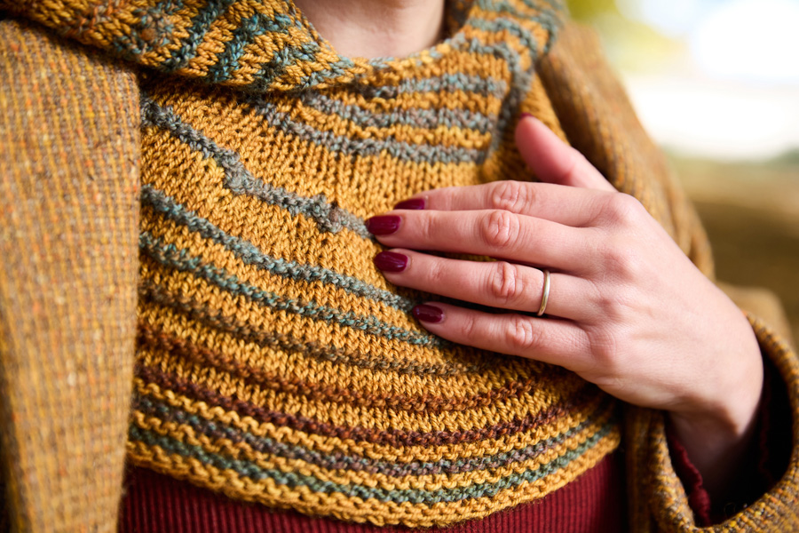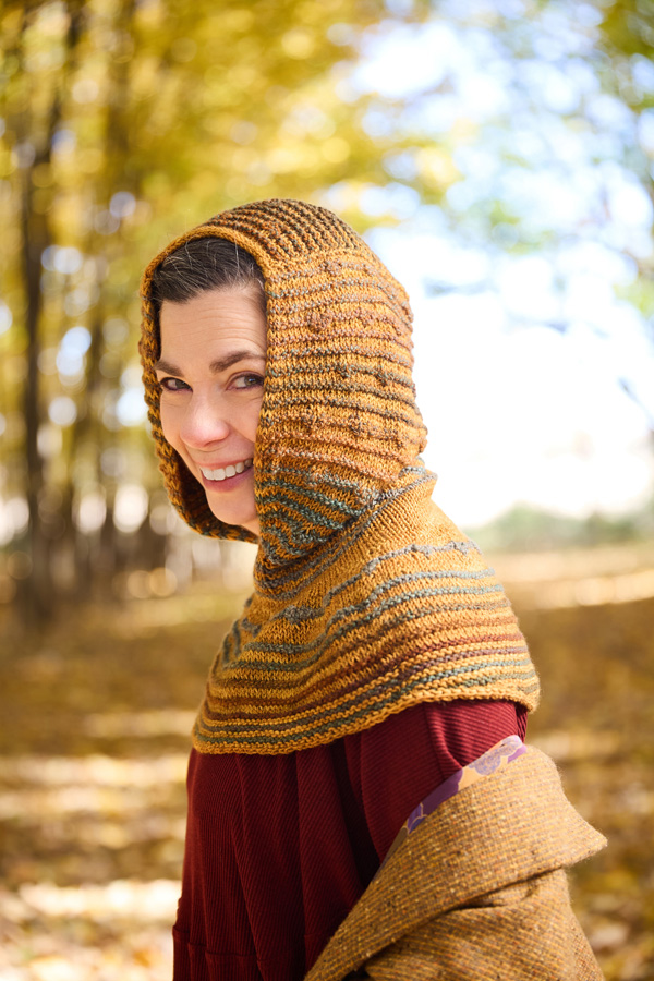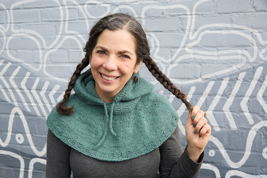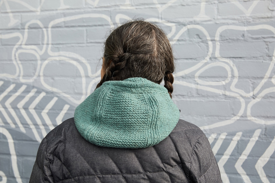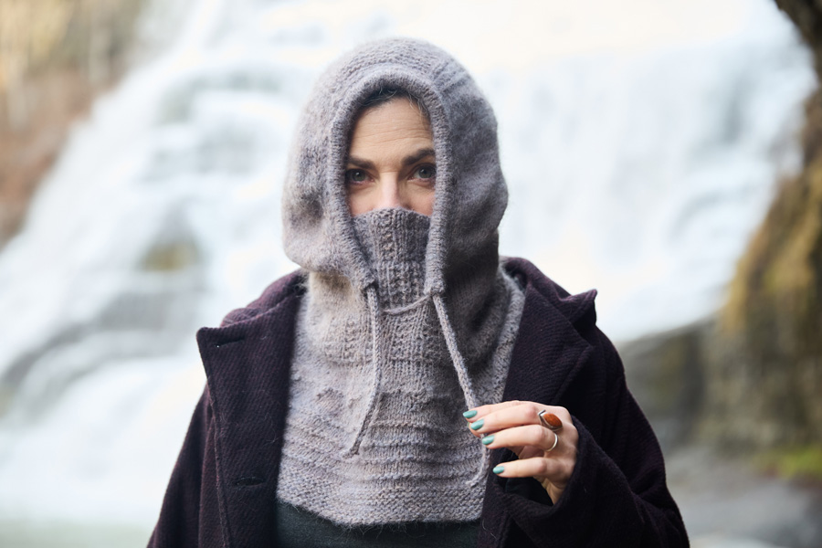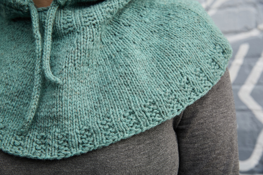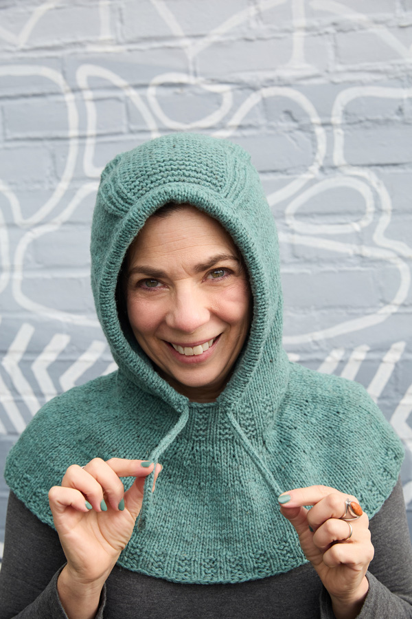 Into The Hoods Dickey is worked from the top down. It starts with a rectangle that uses an i-cord cast-on and my signature Lola’s Pick Up Line technique. The body of the hood flows off of this base towards the neck. Then you join into the round and knit a yoke with short rows to cover your shoulders. The dickey drapes over your shoulders and tucks under your jacket. Add the optional casing and drawstring to cinch it up around your face, keeping the cold out and the warmth in.