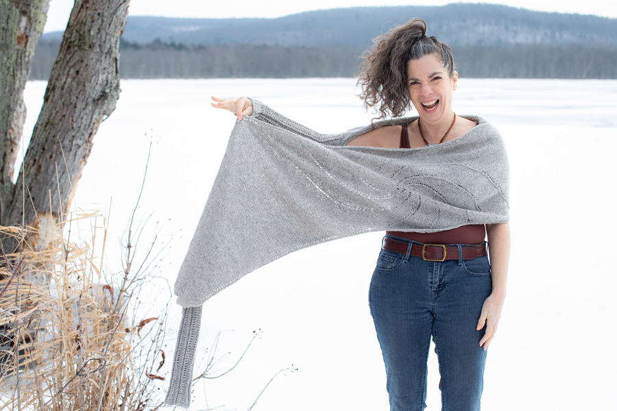 I designed Lake Hug for Patty Lyons Affiknity retreat with Green Mountain Spinnery’s Cotton Comfort DK. It is woolly-but-not-too-warm and 100% USA-sourced. The organic cotton is from Texas, the Targhee wool is from the Front Range, and it’s spun together with love in Vermont. The fabric is elegant but casual, light but warm, wearable year-round. Exactly the texture you want in a wrappable hug.