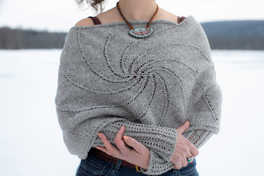 Lake Hug is an easy-to-wear woolly embrace. This hug is worked from the center out in the round, with a 10-wedge oval. From there, each wing grows outward as you knit flat to the sleeves. Next, the sleeve is joined into the round and worked in a lacy rib that hugs your arms just right. Finally, an attached I-Cord edging is worked all the way around the edge to finish with a flourish! I’ll be teaching you how to work that with a trusty I-Cord tool or your needles—your call.