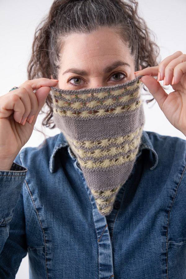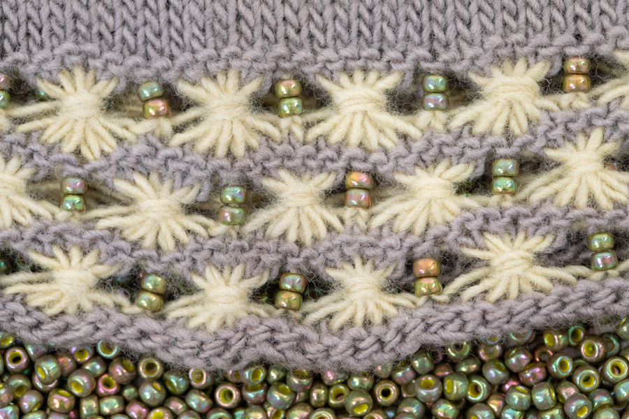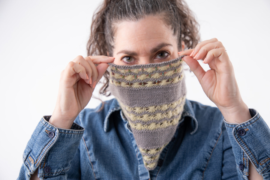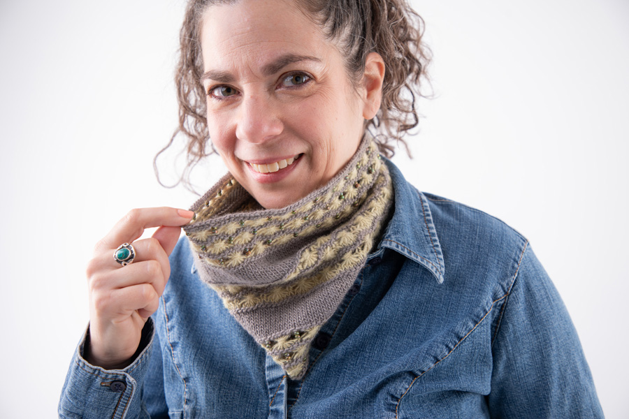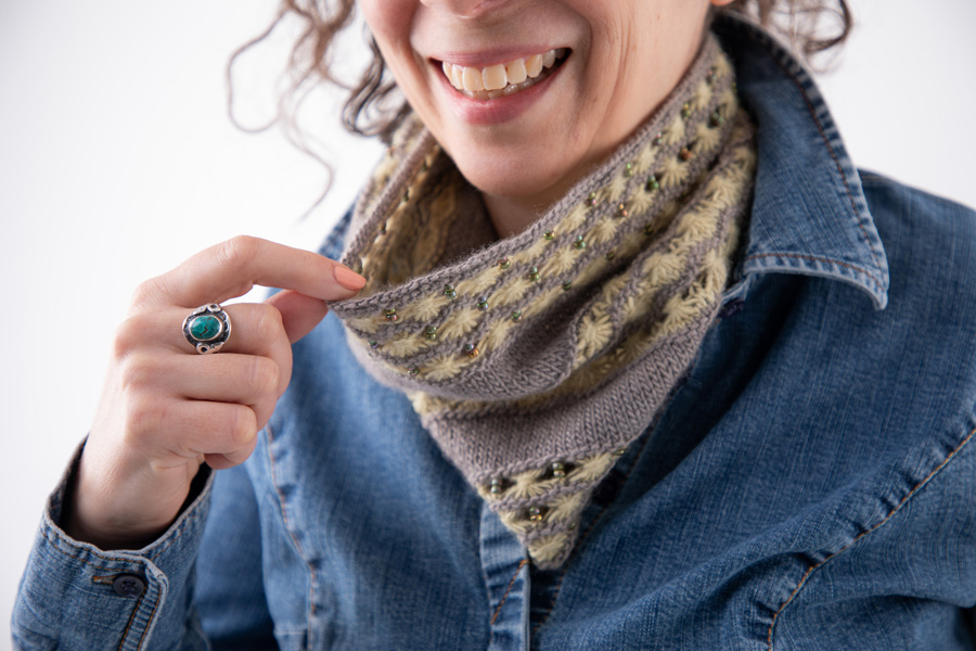 Ceci is back! And this time, she’s showing off as a simple yet elegant two-color cowl. You might remember the beaded flower stitch from Ceci T’s integrated necklace — that same fancy stitch that looks far more complicated than it really is. It plays with elongated stitches that are wrapped to create little bundles, with beads nestled between the flowers to highlight the negative space. Just a touch of bling to make the yarn shine.