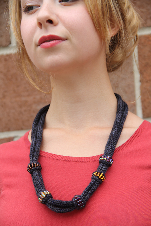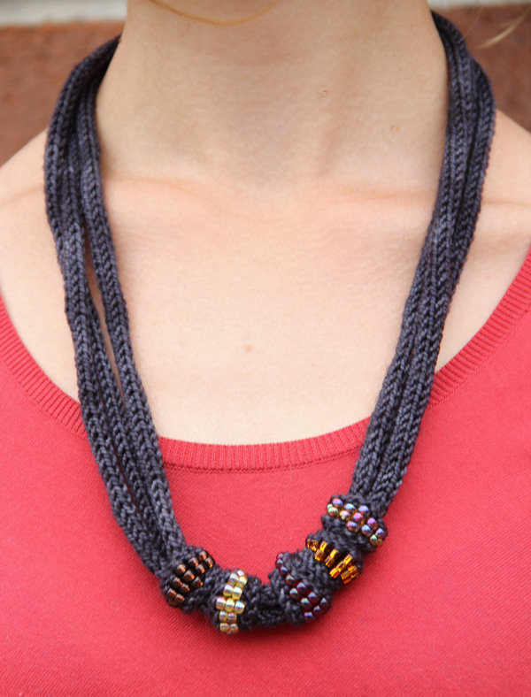 Fino is constructed with one long I-cord that is banded together by individually made “beads”... These “bead wraps” are made by placing beads with a crochet hook or Super Floss onto elongated stitches. There are endless possibilities for this technique. You can make one, two, five or twenty beads to wrap your I-cord with... that is totally up to you! Wait until you see how fun Fino is to make... especially if you invest in an I-cord maker!